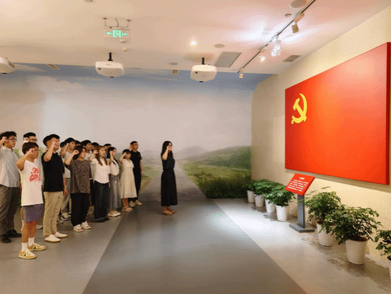 在陈列馆一楼鲜艳的党旗前,光信第一学生党支部书记胡倩文带领全体党员重温入党誓词,右拳紧握郑重宣誓,声声入耳振奋人心,表达了不忘初心、牢记使命、奋发有为的信念和决心。