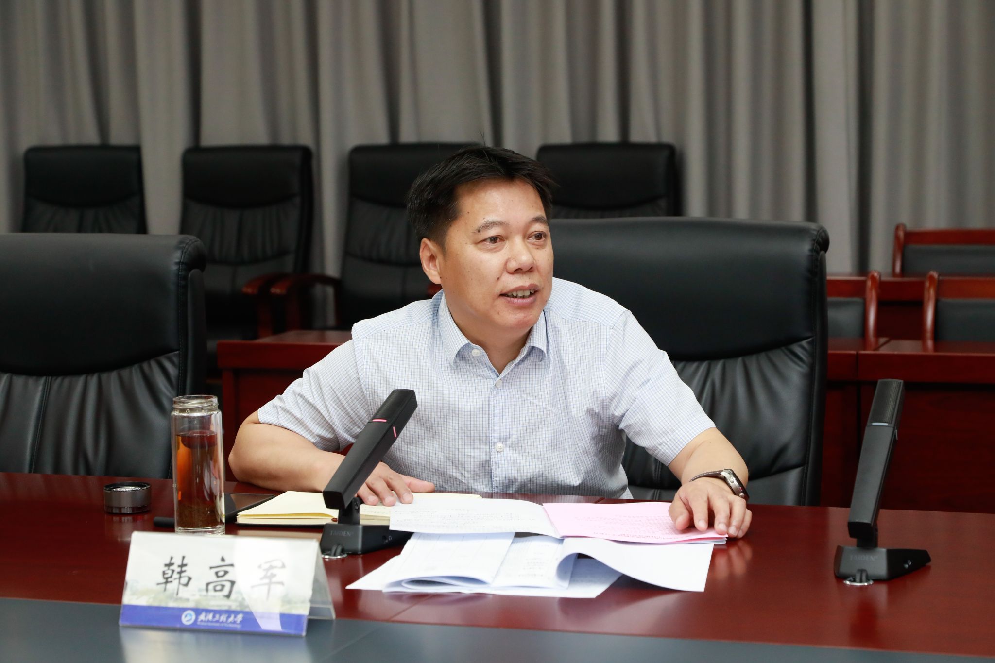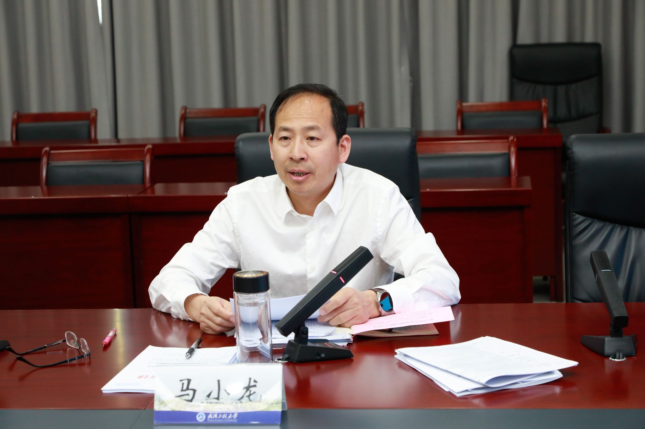 本网讯(通讯员 周雯琪 谭明武)4月18日上午,学校在综合楼103会议室举行深入贯彻中央八项规定精神学习教育工作推进会。校党委书记汪伟,校党委副书记、校长张彦铎,校党委常委、副校长、组织部部长马小龙,校党委常委、宣传部部长韩高军出席会议。会议由校党委副书记(正厅长级)潘慧明主持。