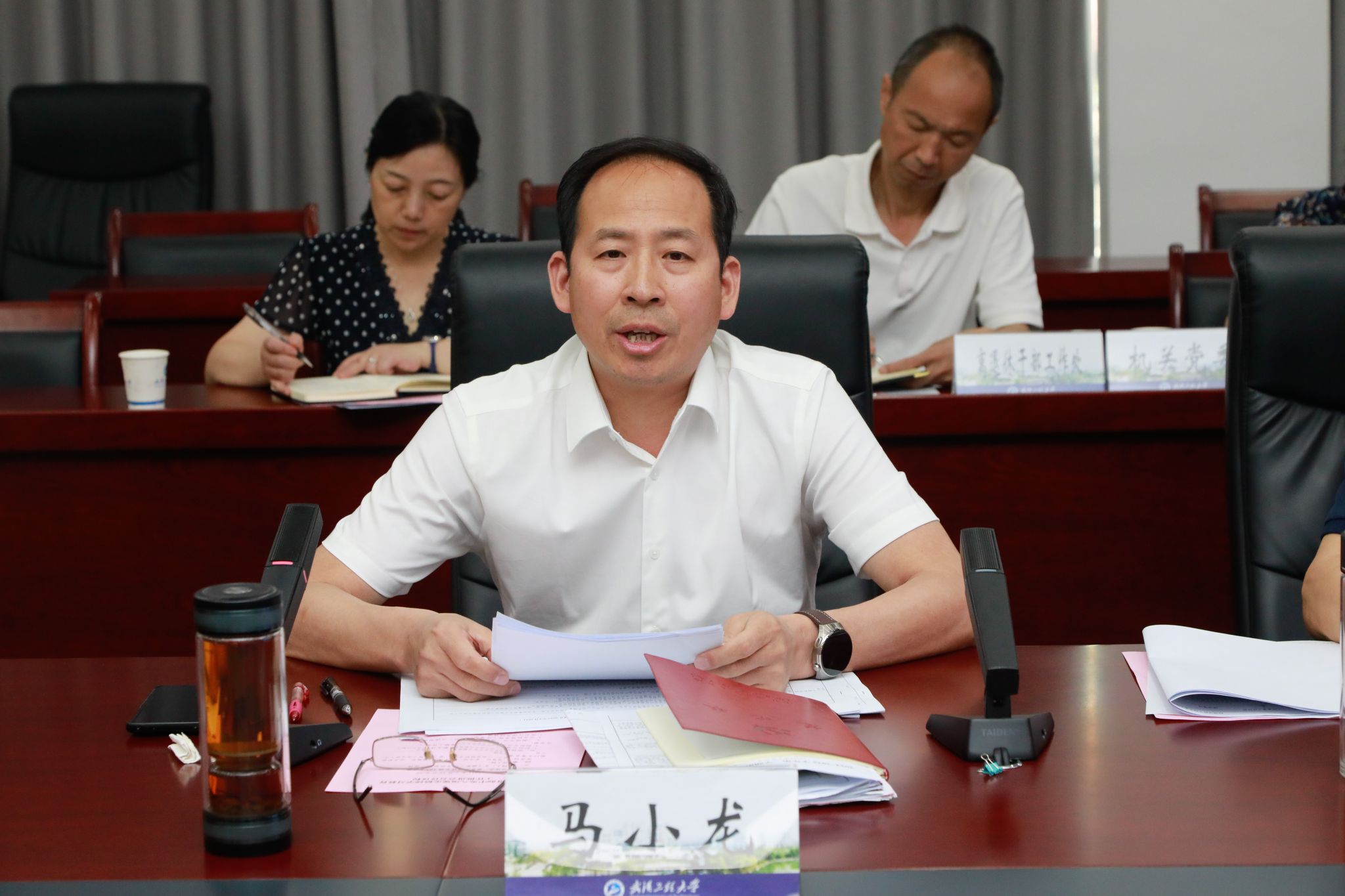 本网讯(通讯员 周雯琪 谭明武)5月26日上午,学校在综合楼103会议室举行深入贯彻中央八项规定精神学习教育工作推进会。校党委书记汪伟主持会议并讲话。校党委副书记、校长张彦铎,校党委副书记(正厅长级)潘慧明,校党委副书记李志旭,校党委常委、副校长、组织部部长马小龙,校党委常委、宣传部部长韩高军出席会议。