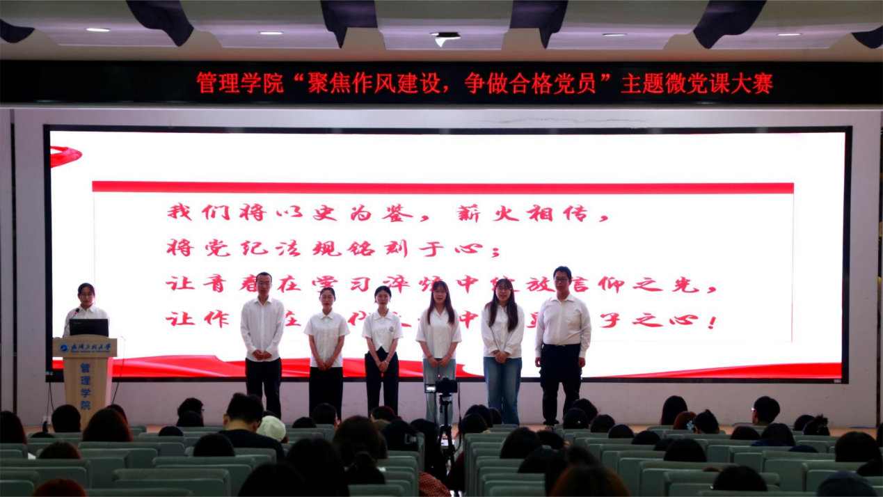 本网讯(通讯员 李梓煜)5月15日下午,在全党开展深入贯彻中央八项规定精神学习教育之际,为进一步加强学生党员纪律作风建设,提高学生党员队伍建设质量,勉励管院学子“强作风、严纪律、树形象”。管理学院在文科楼413报告厅举办“聚焦作风建设,争做合格党员”主题微党课大赛。学院党委书记左辉、副书记罗琼、各党支部书记、学生党员代表、第75期入党积极分子和第17期发展对象培训班全体学员参加活动。