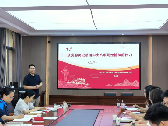 学院教工第六党支部书记陈永贵以《从党的历史感悟中央八项规定精神的伟力》为题,为与会党员讲授了深入贯彻中央八项规定精神学习教育专题党课。机关党委第八支部李茜,马克思主义学院第六支部张映同志以“围绕办成一件事看作风变化”主题进行了交流发言。会上,参会教师聚焦学校研究生培养、思政、招生就业等领域展开深入交流。